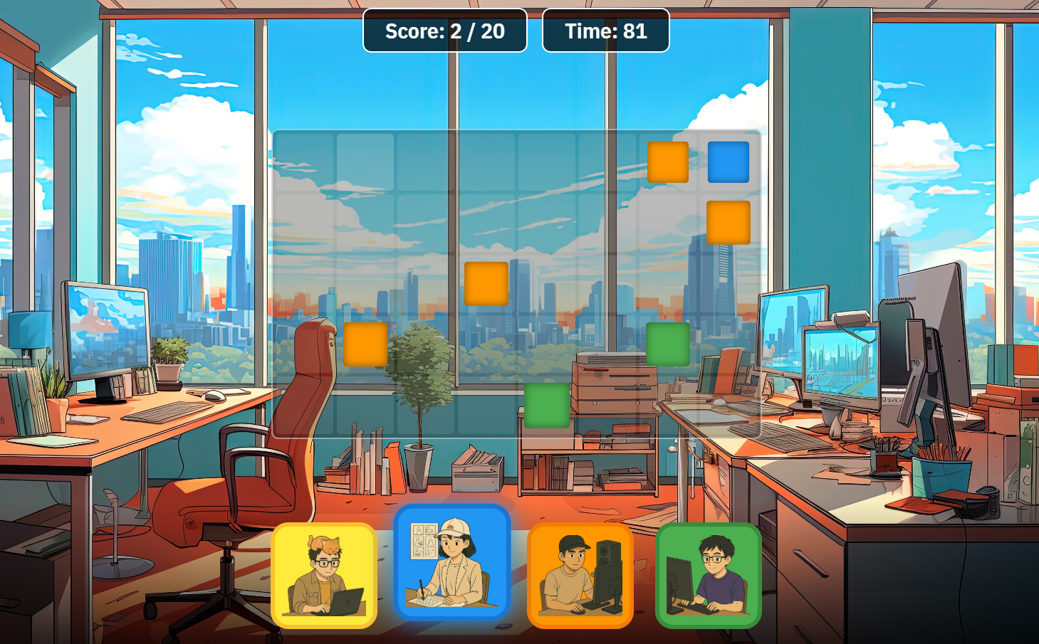 Objective: Catch falling “Idea Blocks” color‑coded by skill (Creative Management, Visual Design, Storytelling, Technical Sound) and stack them evenly.